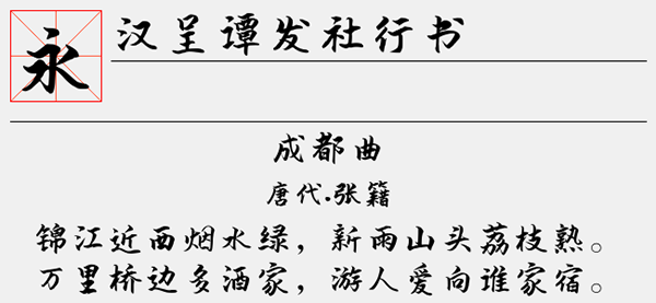 汉呈谭发社行书字体是一款非常漂亮的行书字体,虽然它的笔触有点厚,但整体一致性好。并是由汉呈字库推出的,该字体笔画看上去有点粗,字形非常的行云流水,字体的角度、大小、距离都设计得非常恰当,整体效果极佳,可以很好的应用于文本装潢、信息展示、网页设计、篆刻制模、数据制作、装潢设计、计算艺术设计、视觉设计、字帖等一切合法应用场景,有喜欢的朋友可免费下载收藏。