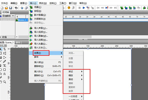 在工具栏中中我们要认识六个插入按钮和三个播放按钮,五个插入按钮分别插入场景、文本、图片、内容、按钮和精灵,三个播放按钮分别播放影片、时间线及各个特效的动画效果。