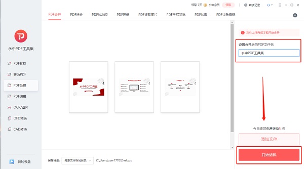3、上传所有需要合并的PDF文件后,可以设置合并后的PDF文件名字,点击“开始转换”,耐心等待数秒,就完成啦。