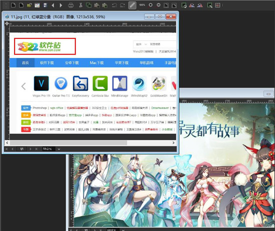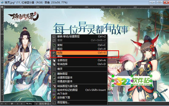 2、接下来我们将下图左上角图片中的"3322软件站"logo扣到聊斋搜灵录的图层中