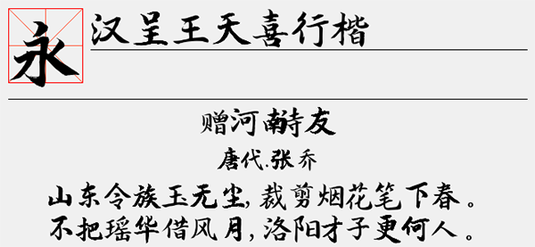 汉呈王天喜行楷字体是一款十分好看的艺术书法字体,它的每一笔都很连贯,而且显得很有气势,潦草不失雅观。字形开正端庄,通篇整齐均匀,相映如一,同时其笔画强黑粗,运笔轻桦,便捷,线条追求流畅、明快,给人一种非常大气的感觉,并且中英文、阿拉伯数字全面支持,可以很好的应用于文本装潢、信息展示、网页设计、篆刻制模、数据制作、装潢设计、计算艺术设计、视觉设计、字帖等一切合法应用场景。