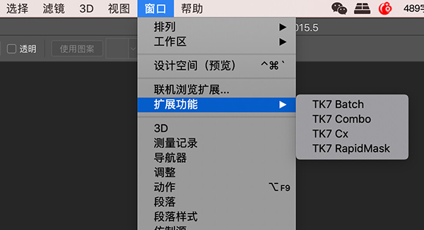 插件一键安装完成后,在ps上方栏的窗口—扩展功能处可以调出tkactions的所有模块,并将选中的模块附着添加到ps的操作面板