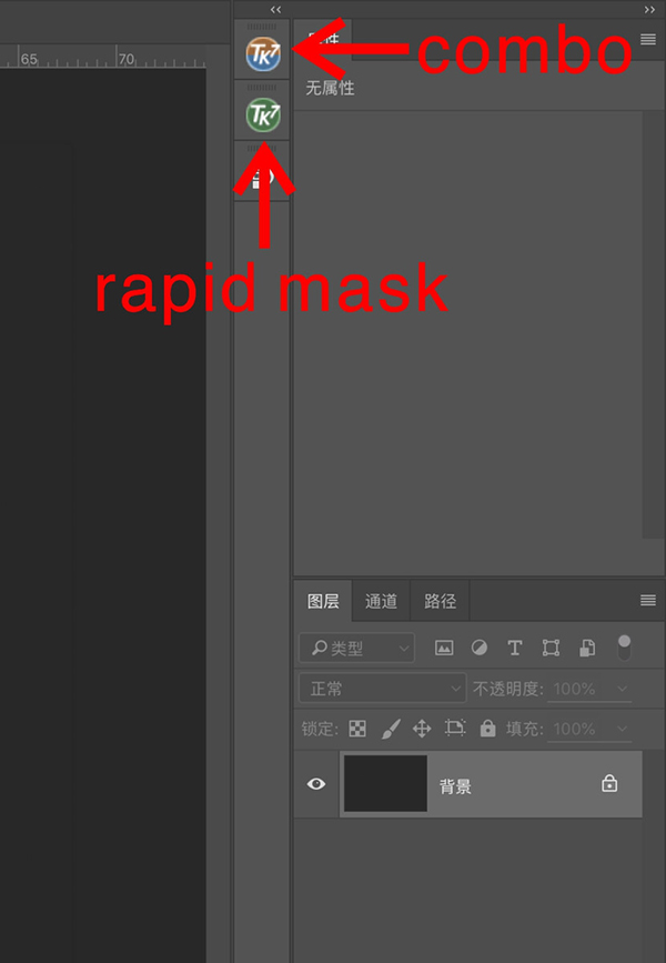 这是我的ps工作界面。大家可以看到只加载附着了两个tk模块在竖栏。第一个就是combo模块,这个模块的功能就是负责图片最后的输出。