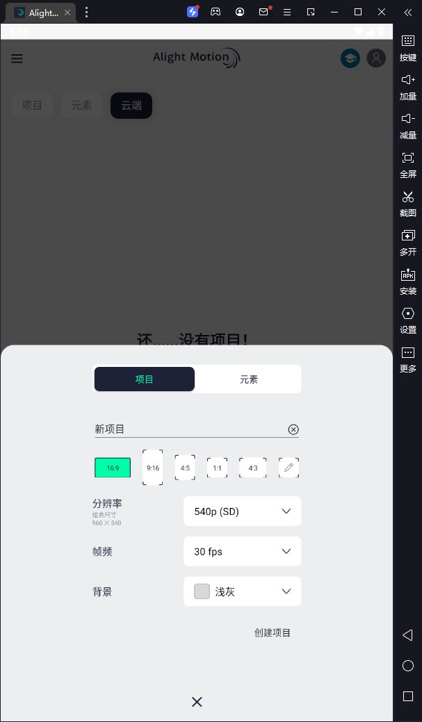2、、可以设置项目名称、宽高比例、分辨率、帧速率、背景颜色;