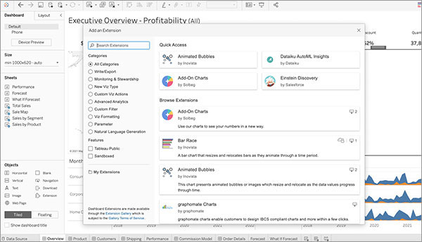 借助产品内的扩展程序库,您只需点击一下,即可找到所有的连接器和扩展程序。您将能够以更好的浏览体验轻松发现各种连接器和扩展程序、搜索和筛选选项,并完成安装,这一切都无需离开您的 Tableau 工作流。