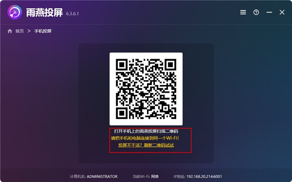 1、打开雨燕投屏电脑版软件,这里点击开始,随后进入链接的界面,你需要连接到自己的手机