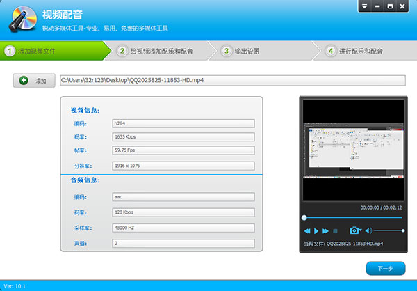 2、按要求增加视频配音文件。点击【下一步】