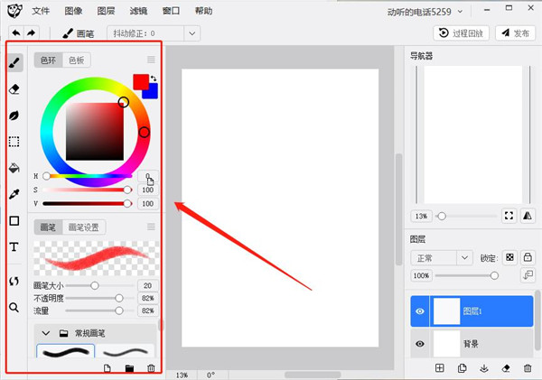 8、左侧是工具栏,所有绘画需要使用到的绘制工具,颜色填充工具和颜色都可以在这个窗口中找到使用。