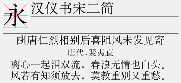 汉仪书宋二简字体是一款非常端正的中文字体,字体字形方正、端庄雄秀、字库完整,写出来的字就很工整整齐,而且粗细均匀。笔画清楚、间隔均匀、排列整齐,起笔和落笔成倾斜形,笔法锐利,结构紧密,清秀雅致。看上去十分美观,整体效果非常统一,且字库完整,适合应用于艺术设计、平面宣传设计、网页设计、文本装潢、信息展示、篆刻制模英文、数据制作、装潢设计、视觉设计、字帖等一切合法应用场景,有喜欢的朋友可免费下载收藏。