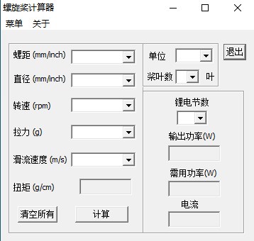 螺旋桨计算器是一款非常实用且专业的螺旋桨拉力计算工具。软件功能强大,它可以帮助设计师们计算一些复杂的数学换算,只要在软件上输入螺距、直径、转速、拉力等等一些参数,工具就可以快速地帮助设计师计算出相应的输出功率、需用功率、电流等参数,以边设计师找到更好的设计方案。软件不仅给用户们减轻了对制作航模螺旋桨计算压力,还给用户提供了安全性能测试,方便设计师们能够制作出更加出众的额螺旋桨作品。软件使用非常简单,界面非常简洁明了,各种参数换算都是按照基本的物理和数学规则进行,换算速度超快,喜欢的用户不妨来下载哦!