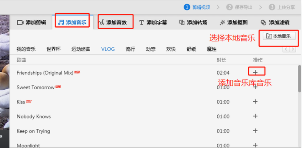 A:您可以从音乐库/音效库添加音乐,也可以添加本地音频,以下分别是专业模式和快速模式音频添加方法