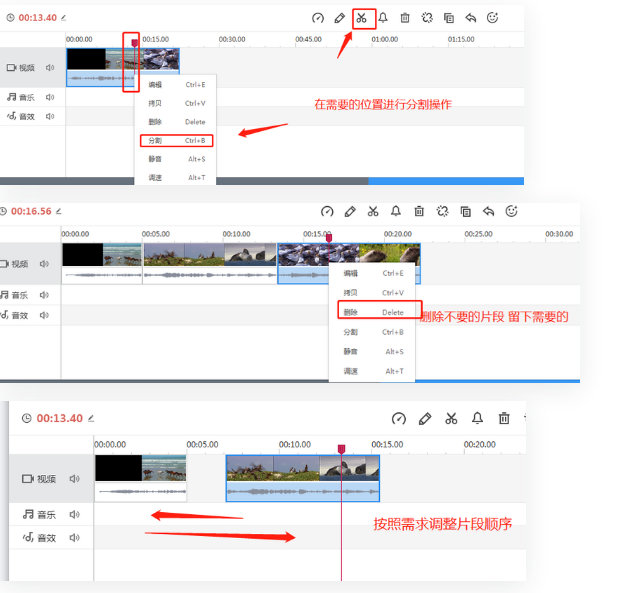1、如何快速剪辑视频(只要视频中间一段) A:除了上面拖拽两端起止点的操作,还可以通过使用小剪刀(分割)对视频进行分割,之后对不需要的片段进行删除操作,时间轴上按照时间顺序留下您要的片段即可。此处以专业模式为例,快速模式是类似的操作哦~