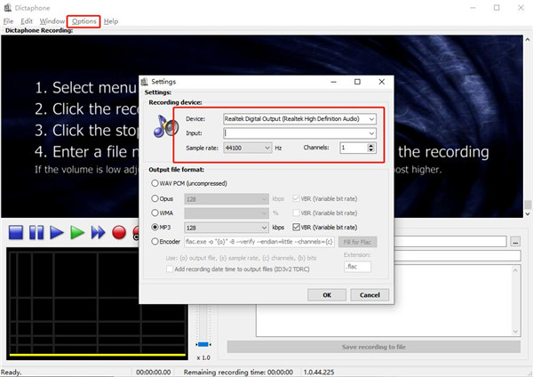 带有一个非常广泛的设置菜单,可让您调整某些设置,您可以选择录制设备,输入并设置采样率,您还可以从多个通道中进行选择,并从许多可用选项中选择输出格式