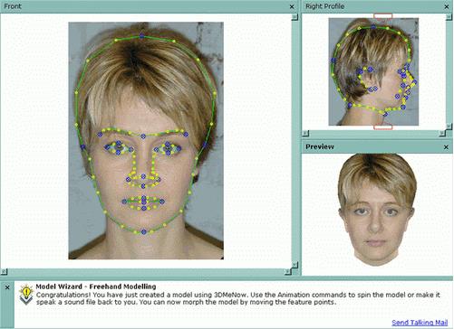 (6) 点击工具栏上的mode工具,选中step 3-freehand modelling,进入自由建模阶段。用鼠标拖动关键点中的基础点(以蓝色显示),拖放到相应的位置。 放好后,点击工具栏上的Medium Points工具,图片上的特征线将显示一些黄点,用鼠标拖动它们,拖放到相应的位置。放好后,点击工具栏上的All Points工具,图片上的特征线将显示更多的黄点,用鼠标拖动它们,拖放到相应的位置。