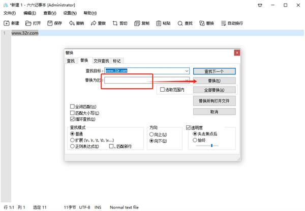 3、替换文本设置页面已经将我们想要替换的目标输入在查找目标框中了。在“替换为”输入框中输入想要替换的文字,输入好后点击[替换]就可以将文本替换成“替换为”输入框中的文字,如果需要替换多处相同文本,就点击[全部替换]