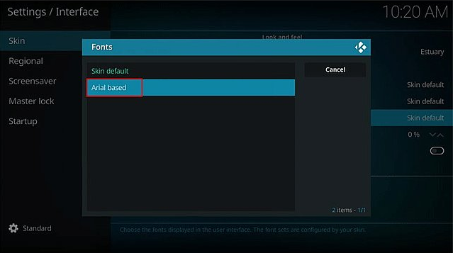 3、选择Skin,移动↑和↓将Fonts字体更改为Arial based;