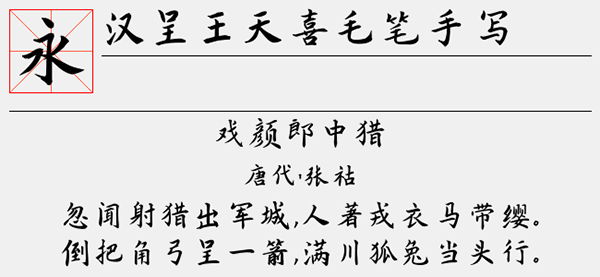 汉呈王天喜毛笔手写字体是一款赏心悦目、百看不厌’的毛笔手写艺术字体,字体第一眼看上去感觉非常的工整整齐,笔画粗细适中,字形看上去较圆润美观。字体线条粗细适中,字形端正大方得体,整体效果非常的出色,且字库完整。可以很好的应用于文本装潢、信息展示、网页设计、篆刻制模、数据制作、装潢设计、计算艺术设计、视觉设计、字帖等一切合法应用场景。