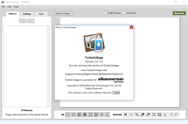 您可以将图片移动到工作环境中的首选位置,删除所选图像,调整对象的大小,锁定图像和文本以及在拼贴画中随机播放项目。TurboCollage允许您在不同的拼贴图案之间进行选择(马赛克,图片堆,图片网格,中心框架,之字形马赛克)。