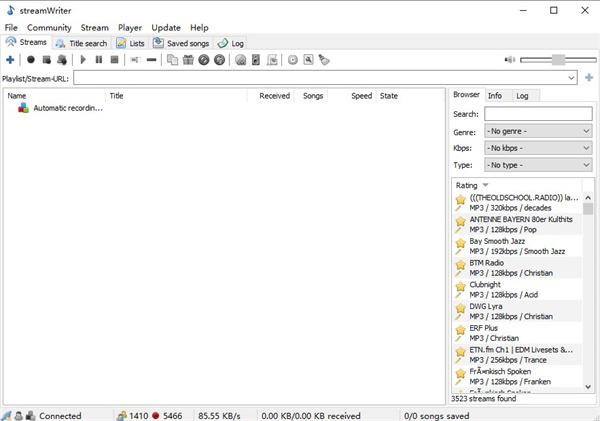 streamWriter官方版是一款适用于 Windows 的网络电台智能录音工具,可录制互联网广播电台播放的音乐。软件体积虽然小巧,但功能绝对不容小觑,支持多种格式的音视频文件读取,十分强大!streamWriter还支持自定义时间录制,可以对录音操作指定时间段,还可以对在多指定时间段内的网络电台播放内容进行录制,并具备保存标题的手动剪切功能。需要的朋友欢迎下载使用!