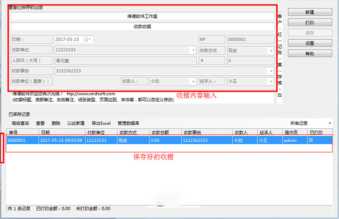 4、可以对收据进行保存、修改、删除、查询等管理操作