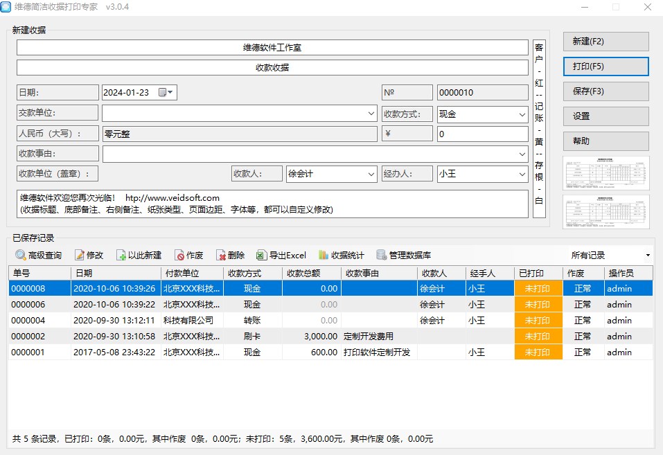 一款针对简洁性收款收据进行打印、管理的软件,收据内容包括“交款单位”、收款方式、“收款事由”、“收款金额”、“人民币(大写)”、“收款人”、“经手人”等,功能简洁、易操作且很实用!