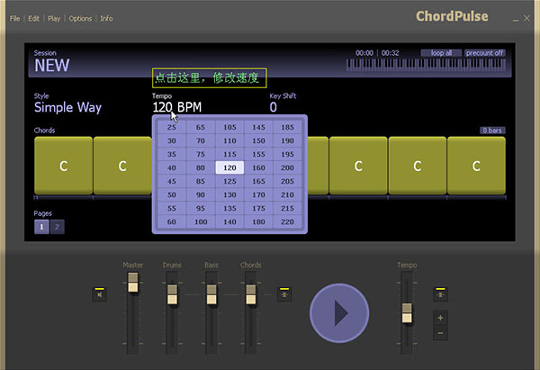 对于喜爱音乐创造的用户而言,经常性的需要录制一些Demo,但有时候因为找不到合适的伴奏或者团队成员不在,从而导致录制失败。为了帮助广大用户解决此类问题,小编本次带来的是ChordPulse,这是一款专业性极强的音乐伴奏软件,其不仅内置了鼓机、低音、节拍器、和弦等多种伴奏可供用户随意进行使用,还直接升级提供了178种音乐分格可供选择,并使用起来也是非常的简单,只需要导入需要处理的midi文件到第三方音序器里面编辑,再写入歌曲的和弦就可以做出完整的伴奏啦,并完成后还能直接在软件中进行播放试听,觉得合适即可保存导出。另外,当你在制作音乐的时候毫无灵感,那么也可以使用该软件中所提供的音乐或乐器随意混合搭配测试下,说不定还能激发你的音乐灵感,毕竟素材十分的丰富全面,只要有一丝的想法都可以直接通过其中所提供的不同音乐风格和和弦进行演奏来测试你的幻想,总之呢,该软件十分适用于音乐练习、灵感、即兴创作和纯粹的音乐乐趣等场景。