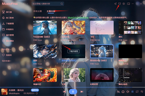 3、想要更改主题的话,需要先点击右上角的小衣服在点击主题市场看到自己喜欢的下载使用就好了,也可以下载下载主题包使用。