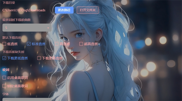 2、关于桌面歌词的设置也提供了颜色和字体大小的简单设置,也够用了。