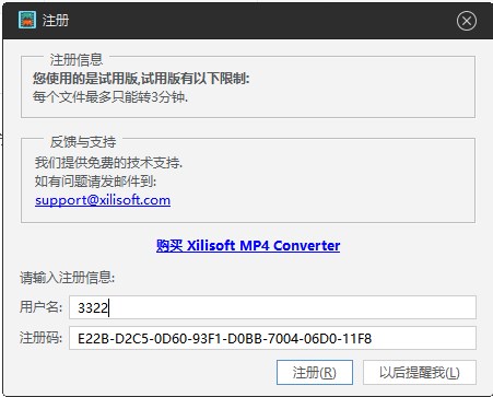 8、打开Xilisoft MP4 Converter,在注册框中输入上面获取的注册码,用户名随便写即可