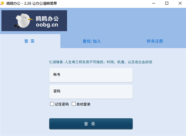 鸥鸥办公软件是由杭州九慧科技公司自主开发的一款功能十分强大、操作简单、实用性强的即时协同办公软件。鸥鸥办公软件主要基于tcp/ip模式,企业员工可以在企业内部通过软件可方便进行办公文件传输,全方位实现即时协同办公,建立紧密、协调、智能的团队工作关系。鸥鸥办公也可以增强企业内部沟通能力,提升协同办公效率,降低企业运营成本,提高企业生产力。