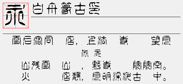 白舟篆古印字体是一款很好模仿了古代篆书字形的印章体。其秉承了篆书的特点,较为扁圆,由于属于印章体,所以笔顺不是很连贯,部分笔画是有中断间隔的。不过该字体唯一的遗憾就是不提供对应英文字体,突出中文字体的特点。古时候的小篆,虽然现在认识的人不是很多,不过一般在印章上都是使用小篆进行雕刻的。可以很好的应用于文本装潢、信息展示、网页设计、篆刻制模、数据制作、装潢设计、计算艺术设计、视觉设计、字帖等一切合法应用场景,有喜欢的朋友可免费下载收藏。