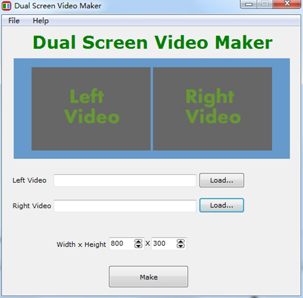 双屏视频制作器允许您通过指定文件的宽度和高度来手动输入最终视频的分辨率。另外,为了更快地进行选择,您可以加载具有希望应用于视频合并的尺寸的视频。该程序可以从第三个文件复制有关视频大小的数据,并将其应用于输出视频。单击“ Make”(合并)按钮后,合并过程立即开始,您可以使用选择的文件名将结果保存到所需的文件夹中。