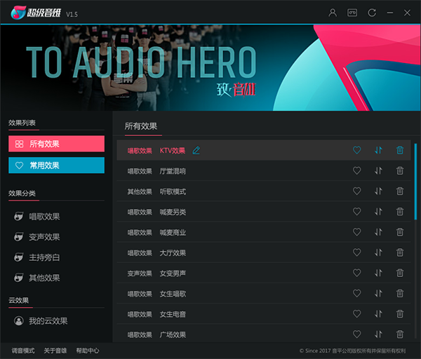 超级音雄是一款非常不错的专业的调音软件,这款软件有着十分简洁的界面,在这里每一位用户都能够十分简单的进行操作,这里还有着非常多的音效,并且内置有超多的声卡驱动、数十种音效提供,支持目前一些主流或不主流操作系统运行。这款软件主要是为用户打造一款完美的K歌音效和简单的操作,并且软件的内存占用十分小,非常的不错,效果也是十分多,给用户最好的体验。主持旁白、其他效果,另外还支持云效果调试,非常的不错,有需要的用户快来下载体验一下吧。让你享受不一样的声音效果,让你更加爱唱。