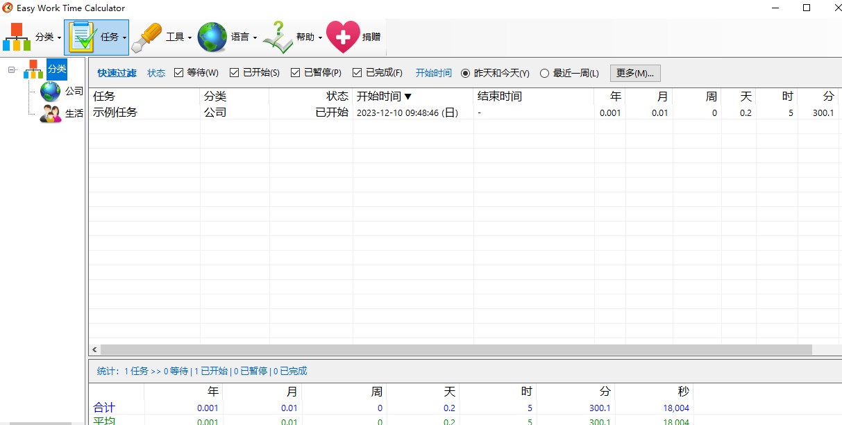 Easy Work Time Calculator官方版是一款十分实用的简易工作时间计时器软件,小巧绿色,占用内存率低,它可以按照秒,分钟,小时,日,周,月,年等方式进行计时测试,并为用户提供了一个方便的工作过滤器,最大限度上提高了用户的工作效率;Easy Work Time Calculator将自动计时,直到项目a任务完成,可以点击停止,从而计算出工作时间,通过时间计算,能够帮助用户更好的提高工作效率,适用于企业人员使用;Easy Work Time Calculator官方版中,各日期时间元素的值会自动刷新,并且您可以设置刷新频率,还能在本程序中开始、重命名、删除、暂停、继续、停止您的任务,有兴趣的小伙伴快来下载体验吧!