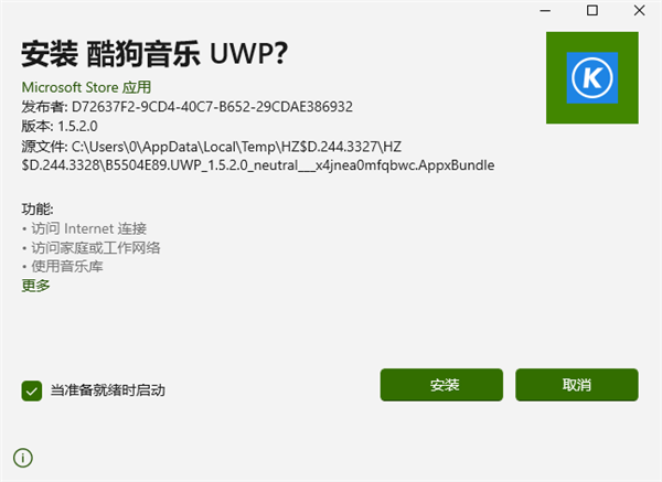 2、点击安装按钮即可立即安装酷狗音乐uwp版;