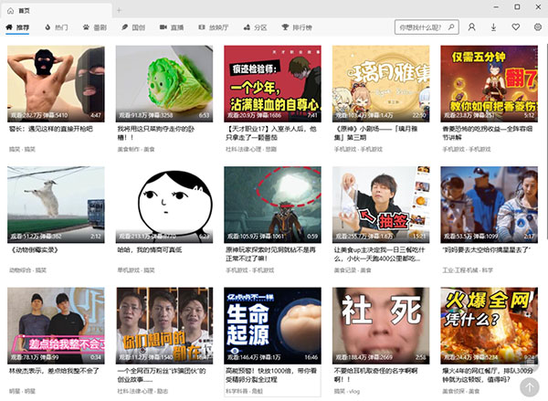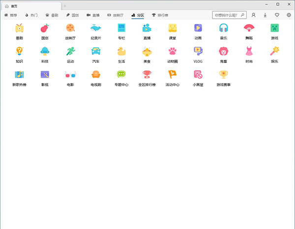 主界面的左上角可以选择不同的B站分区,推荐、热门、番剧、国创、直播、放映厅、分区、排行榜2、主界面的右上角图标依次是:搜索框、B站账号登录、下载列表、打赏此款UWP版软件的制作者、软件设置