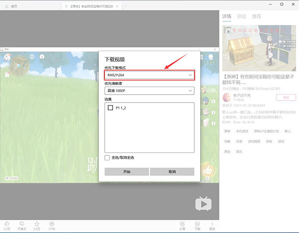 4、点击下载按钮之后,可以选择下载格式、清晰度、选集,选好之后点击开始即可下载