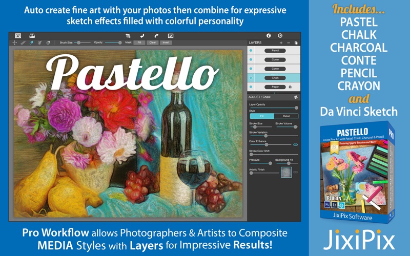 JixiPix Pastello是一款功能强大的蜡笔画工具,软件能够一键让你的图片照片变成好看的蜡笔画效果,支持多种滤镜特效,摄影师和艺术家现在可以超越相机把图像文件转换成创意作品类似于传统手工媒体使用专业的工作流程,方便和舒适的操作。JixiPix Pastello电脑版包括粉笔,木炭笔,彩色铅笔,石墨,Conte或蜡笔效果等,内置了丰富的笔刷库和样式库供用户选择,只需要一键便可以将照片变成艺术画样式,且拥有人性化的控制参数,支持对细节进行调整;JixiPix Pastello电脑版中用户需要使用图层上的添加选项将粉笔更改为粉笔、木炭、彩色铅笔、石墨、孔蒂或蜡笔,通过在顶部堆叠多个层来构建阴影和颜色,但是使用不同的层次组合起来,能构建一幅有趣的、富有表现力的、充满个性的艺术作品;有兴趣的小伙伴快来下载体验吧!