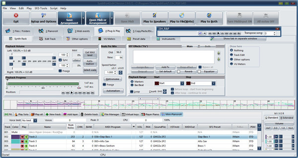 4、即插即用-在此页面上,您可以选择查看MIDI轨道并更改与播放有关的一系列参数。在这里,您可以将SoundFonts,预设,VST乐器和VST效果分配给轨道。