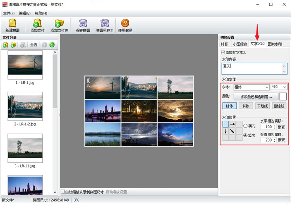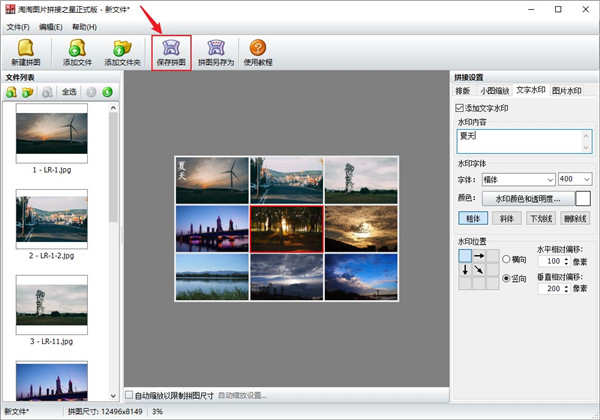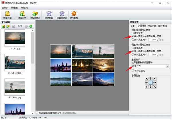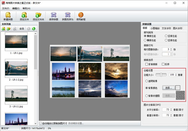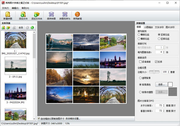 一、丰富的图片拼接排版设置 可以任意设置拼图的行列数,如单行、单列、多行多列 排版时支持按图片列表中相反的顺序排版 支持紧凑排版,可以消除大小图之间的空隙 支持多种图片排列顺序,如:横排左起、横排右起、竖排左起、竖排右起 二、多图拼接智能化缩放功能 自动缩放设置以限制拼图的尺寸 支持缩放原图图片,可以统一原图的宽度或高度 支持多种图像缩放重新取样插值算法,如最近相邻、两次线性、两次立方算法等 支持输出JPG、JPEG、PNG、GIF、BMP等常用图片格式 三、图片拼接更多功能 支持边框添加背景纹理图或单色背景 文字水印和图片水印都可以设置水平和垂直相对偏移,精确水印位置 图片水印可选择系统水印或自定义水印 支持手工自由拖放图片以改变图片在拼图中的位置淘淘图片拼接之星使用教程