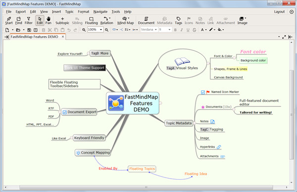 1、提出了创新的概念:Homemap,就像你上网时的主页,乃是你管理常用资料,文档,网址和程序的一个信息中心。2、无限制的主题(分支)位置,不像其它的一些同类软件,第三级以上的主题(分支)位置总是固定的。