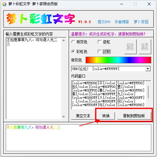 3、点击转换即可生成对应的彩虹文字,一键复制到剪贴板即可免费使用。