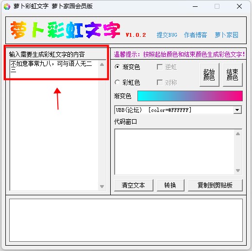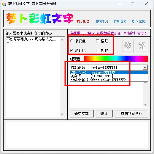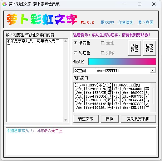 萝卜彩虹文字是一款彩色字体制作软件。萝卜彩虹文字软件能够生成彩虹文字或渐变文字,用户只需输入要生成彩虹字的内容,设置好相关参数,即可输出相应的彩虹文字。并且萝卜彩虹文字制作软件还可以设置初始颜色和结束颜色,生成的代码能够支持ubb论坛、QQ空间和Html网页,输入的文字越多效果越好。