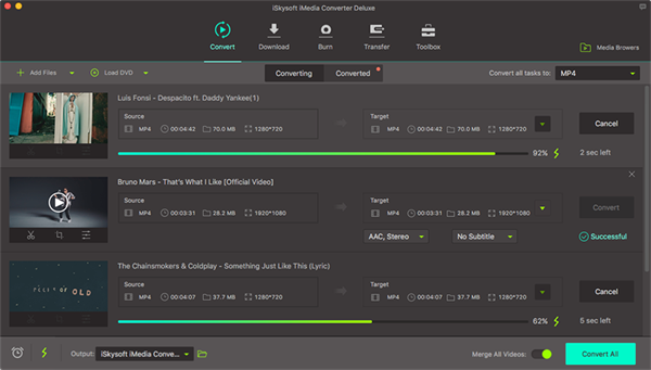 iSkysoft iMedia Converter Deluxe支持将视频/音频文件转换为150多种格式,包括MP4,HD MKV,AVI,FLV,M4V,DV,MP3,M4A,WAV,AAC等。您可以欣赏音频/视频任何设备与Mac视频格式转换器的帮助。