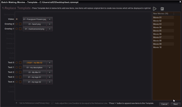 这里我们勾选了 Video line 作为Reference Line,在 Text 0 line 上按下 item "01 - my title 02",然后输入了 10 个新的标题,所以在右边的列表中有 10 个新电影,我们可以按“Preview 预览模板”按钮进行预览每个新电影,并按“保存保存模板”按钮将这些新电影保存为视频项目文件,然后按“下一步”按钮。