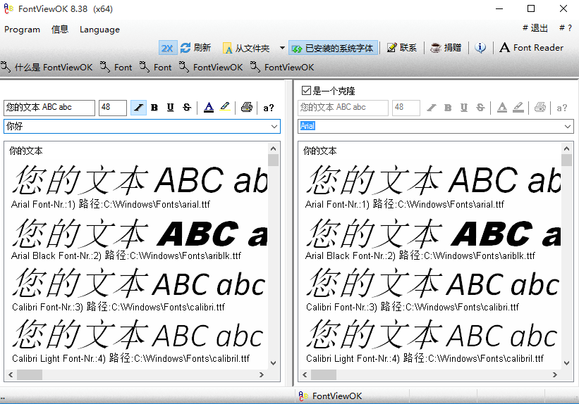 FontViewOK一款可以输入一个字或字符串,便使用所有存在Windows内的字体来呈现对该字或字符串,相当好用。对于经常要使用字体的朋友来说,常常为了挑一个字体对该字的适合显示样式,就必须要一个个来对字体输入后看样式,非常麻烦。