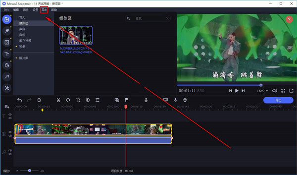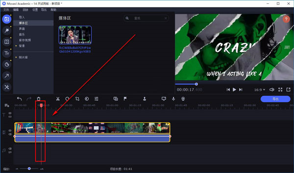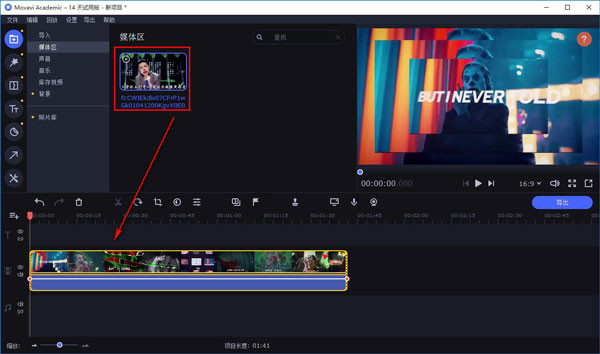 4、然后我们可以在界面上的媒体区查看到刚刚添加的文件,用鼠标点击文件不动,将文件添加到界面下方的时间轨道上