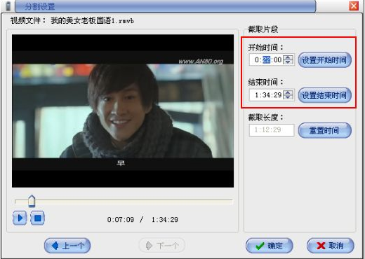 2、在文件列表中,选中需要截取片段的视频,点击窗口右边的“分割设置”按钮,进入“分割设置”窗口,可以直接修改开始时间和结束时间,也可以播放预览到需要截取的部分,点击“设置开始时间”按钮来读取当前预览时间作为开始时间。点击“上一个”、“下一个”可以对所有添加进去的视频依次设置,设置好后点击确定按钮即可;