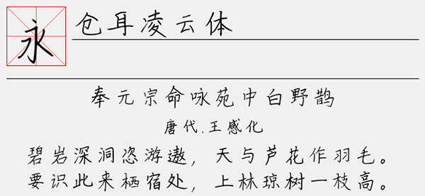 仓耳凌云体字体是一款潇洒俊俏的中文手写字体,该字体字形大气磅礴,其线条细长、自然舒展、俊逸高雅,整个字体显得俊秀,给人一种如沐春风的感觉,将书法之美感又提升到另一种高度,不失其实用价值。可以很好的应用于文本装潢、信息展示、网页设计、篆刻制模、数据制作、装潢设计、计算艺术设计、视觉设计、字帖等一切合法应用场景,有喜欢的朋友可免费下载收藏。