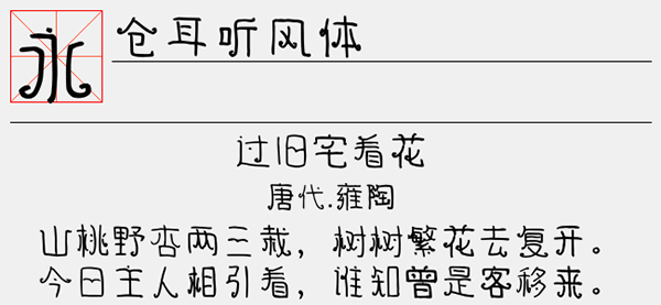 仓耳听风体字体是仓耳字库出品的一款硬笔手写字体,字面开阔,在字体收笔出加入上挑的圆弧设计,轮廓变化丰富,字体风格俏皮可爱。另外该字体非常不错,个性醒目,书写流畅,端正自然,可以很好的应用于文本装潢、信息展示、网页设计、篆刻制模、数据制作、装潢设计、计算艺术设计、视觉设计、字帖等一切合法应用场景,有喜欢的朋友可免费下载收藏。